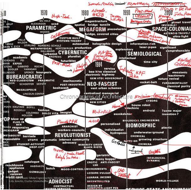 Based on Charles Jencks’s famous work, Chronograms of Architecture shows eight diagrams by eight teams of contemporary architects, researchers, and graphic designers that respond to the historical moment we live in today, revealing critical and urgent ways of seeing, understanding, and working in the architectural culture of the present. Commissioned by the Jencks Foundation and e-flux Architecture, the first six diagrams bring up questions relating to techno-optimism and techno-bureaucracy, feminist spatial practice and racial disparity, and the ecological implications and productive conditions of architecture. Of the last two—commissioned in conjunction with the exhibition presenting the project at CIVA in Brussels—one plots the history and influences of circular building strategies, while the other maps the definition of the discipline through chronograms themselves.